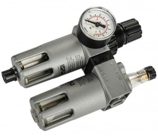 A levegőelőkészítő egység a szűrő-szabályozó-vízleválasztó és olajzó egységből áll össze.