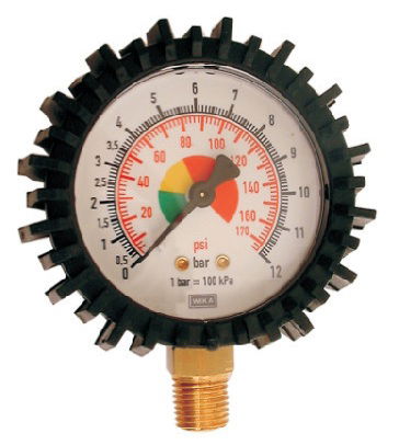 A TG-11 tömlőfúvató manométere gumi védőburkolattal.